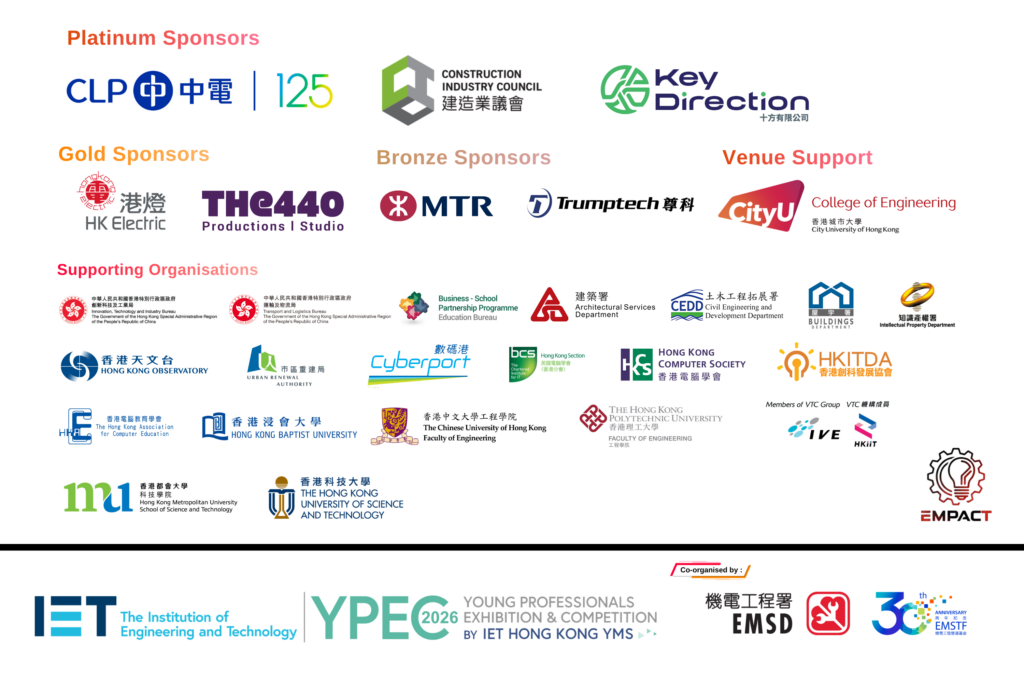 The IET Hong Kong Younger Members Section (YMS) extends its sincere gratitude to all the Sponsors and Supporting Organisations listed below. Their invaluable contributions and steadfast support were instrumental in the success of YPEC 2026